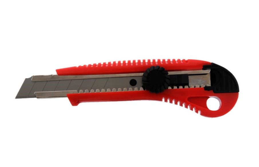 Cutter aus Kunststoff mit feinem geriffelten Kunststoffgriff, mit Metallführung und Klingen-Feststellrad zum Fixieren der Klinge, mit im Griff integriertem Klingenbrecher, Länge 165 mm, Klingenbreite 18 mm