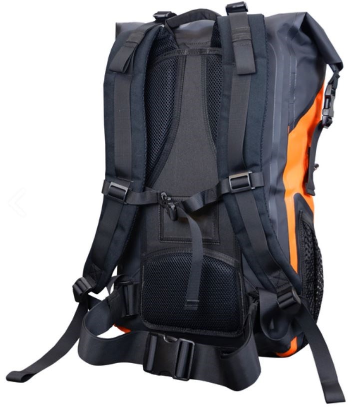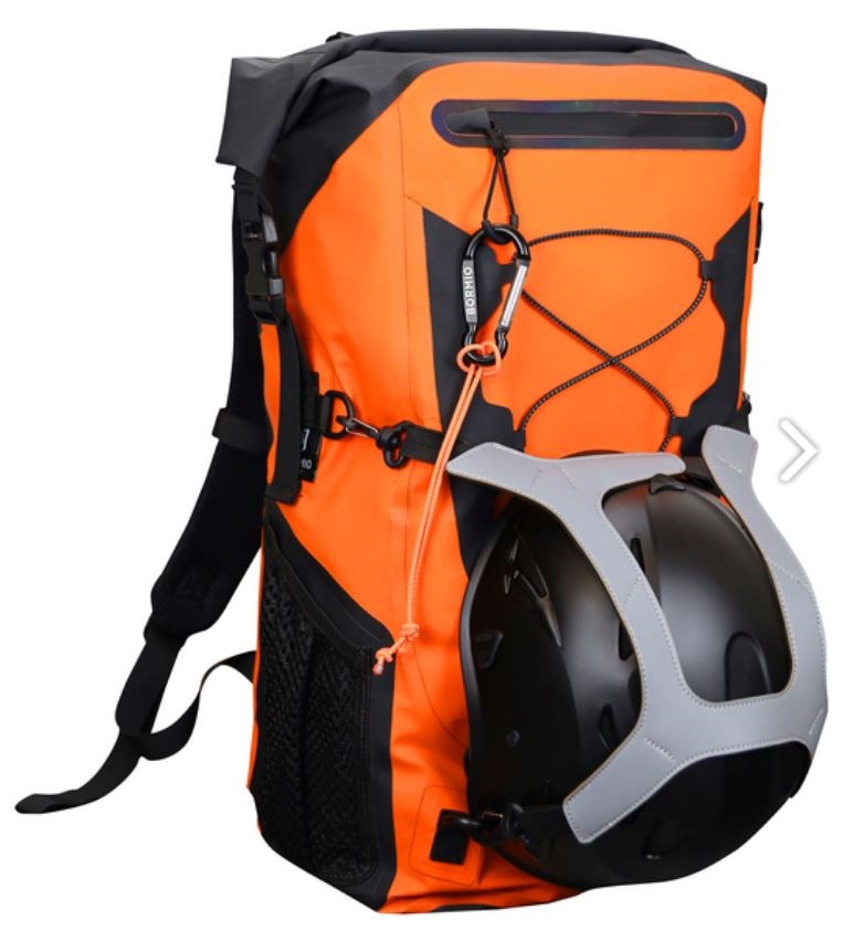 Wasserdichter 35 Liter Baurucksack aus strapazierfähigem 500d PVC Tarpulin mit verschweissten Nähten und vielen technischen Details, der praktische Rolltop-Verschluss schützt vor Regen und Schnee, der gepolsterte Mesh-Kontaktrücken und die verstellbaren, gepolsterten Schulterträger sorgen für einen angenehmen Tragekomfort, der leichte Hüftgurt hilft Lasten gleichmässig zu verteilen und lässt sich leicht abnehmen, seitliches Mesh-Fach und kleines Fach bei der Rucksacköffnung mit wasserdichtem Reissverschluss, die abnehmbare Helm-Halterung aus reflektierendem Material bietet Sicherheit bei dunklen Lichtverhältnissen, reflektierendes, elastisches Kompressions-System zur Befestigung von zusätzlichem Material, der Rucksack kann auch gut in der Hand getragen werden, er besitzt oben und an einer Seite einen gepolsterten Handgriff