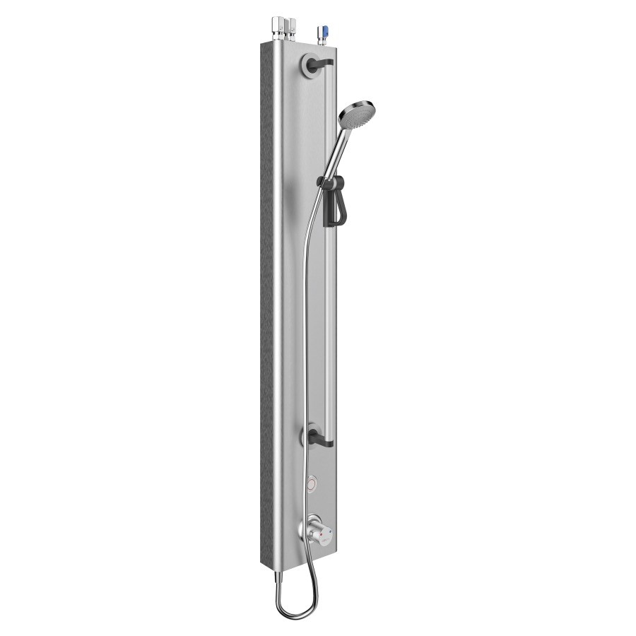Wandmontage, H 140 cm, mit integrierter Frischwasserstation, Thermostatmischer mit Piezo-Taster, mit Hygienespülung, Gleitstange, Handbrause, Anschluss Warm- und Kaltwasser, von oben, Service APP kompatibel , Batteriebetrieb 6 V, Durchflussmenge 9 (L/min), IP68