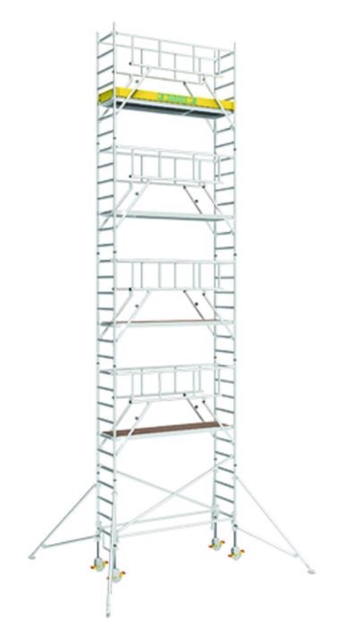 Die fahrbare Gerüstlösung für einen sicheren und schnellen Aufbau, zwei Meter Plattformabstand und weniger Einzelteile, Gerüstbreite 0,75 m, Gerüstlänge 1,80 m, sicherer und schnellerer Auf- und Abbau durch vorlaufendes Geländer (anstelle Geländer und Diagonalstreben) und Plattformen im 2 m-Abstand, Arbeitshöhen von 3,35 m bis max. 13,20 m mit Serienteilen ausbaubar, standardmäßig spindelbare 200 mm-Lenkrollen für millimetergenauen Höhenausgleich, 10 Jahre Garantie, Gerüstgruppe 3 (belastbar bis 200 kg/m²) nach DIN EN 1004