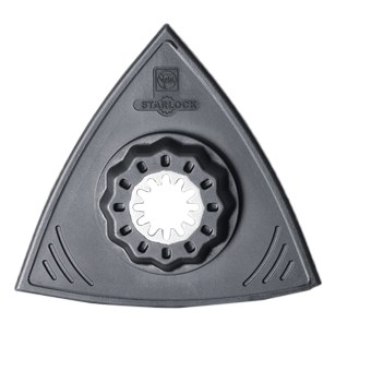 Für sehr schmale, flache Öffnungen, Kunststoff-Trägerplatte zur Vermeidung von Beschädigungen und Markierungen auf dem Werkstück, Dreiecksform, flache Ausführung, Klettenhaftteil, Aufnahme Starlock SL, passend für: Fein MultiTalent, MultiMaster, SuperCut und Bosch, Makita, Milwaukee u.v.m.