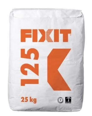 Fixit 125 ist ein Gipsputz mit Haftvermittler zum Ausgleichen direkt auf alte putzartige Untergründe, tragfähige Farbanstriche, Kalksandsteine oder Beton im trockenen Innenbereich, das sehr gute Stehvermögen erlaubt eine Schichtdicke ab 2 mm bis mehrere cm in einem Arbeitsgang, kann auch zum Ansetzen von gipshaltigen Bauplatten verwendet werden, Schichtdicke mindestens 2 mm, Verarbeitungszeit ca. 45 Minuten, Verbrauch ca. 1 kg/m²/mm