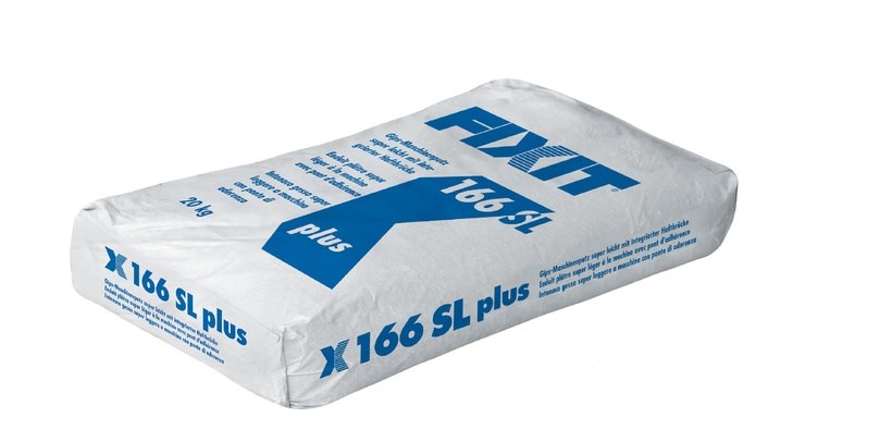 Fixit 166 SL plus ist ein Einschicht-Gipsputz mit integrierter Haftbrücke zum Glätten auf Wände und Decken im Trockenbereich, er kann auch als Gipsgrundputz verwendet werden, als Untergründe sind Backstein, Kalksandstein, Naturstein, Porenbeton und Beton geeignet, bei unregelmässig saugenden Untergründen ist vorgängig die Fixit 496 Aufbrennsperre aufzutragen, Druckfestigkeit (28 d) ≥ 2 N/mm², Biegezugfestigkeit (28 d) ≥ 0,8 N/mm², minimale Schichtdicke 10 mm (ausser auf Betondecken 5 mm), Verarbeitungszeit ca. 90 Minuten, Verbrauch ca. 0,5 kg/m²/mm