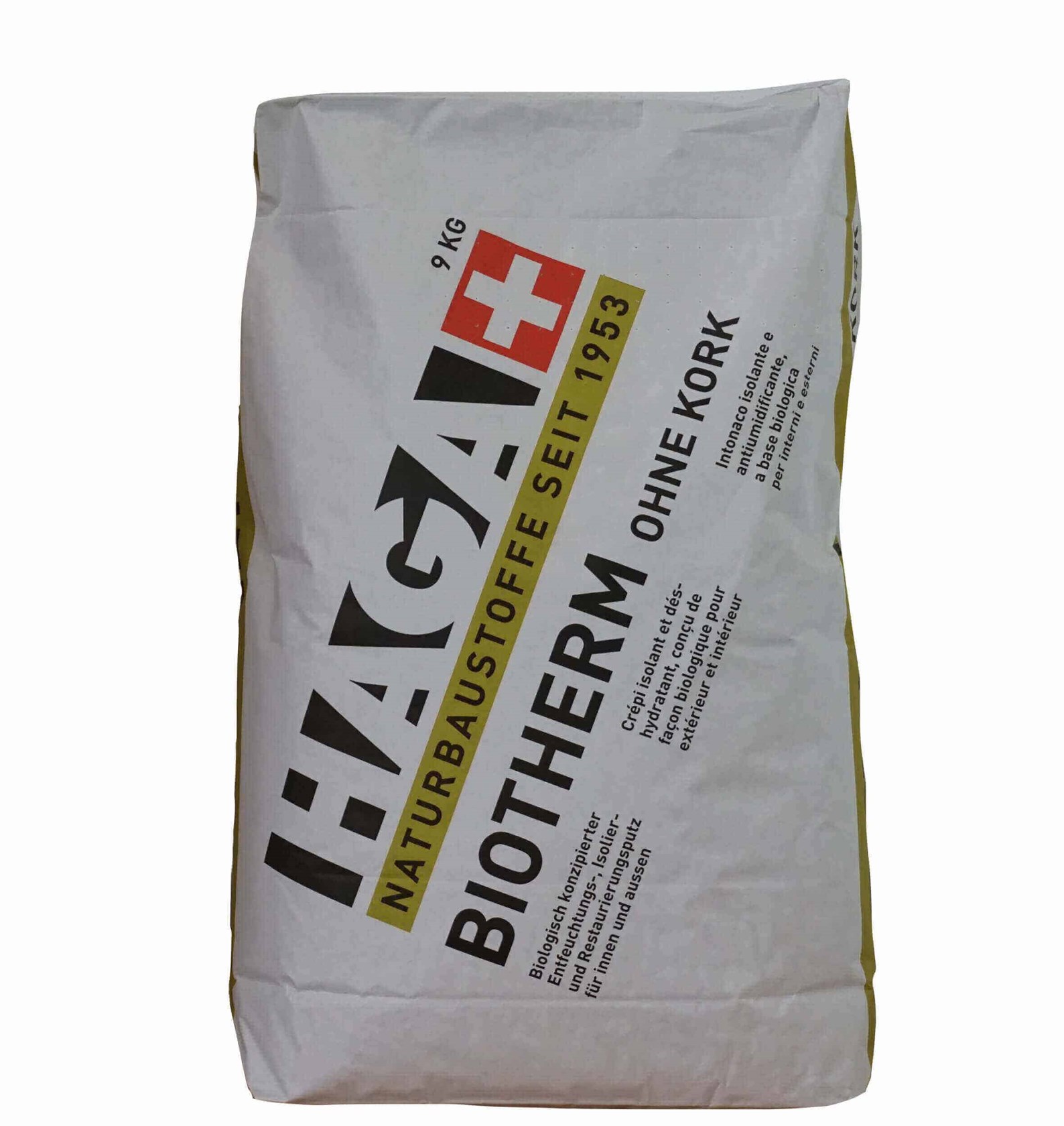 HAGA Biotherm ohne Kork ist ein biologisch konzipierter Dämm- und Entfeuchtungsputz für den Innen- und Aussenbereich, dank seiner kapillaraktiven und diffusionsoffenen Eigenschaften ist er hervorragend für Renovationen von Altbauten, für feuchte Keller und für wohngesunde Bauten geeignet, er wird innen ab einer Putzstärke von 6 cm ausgleichend und regulierend gegen feuchte Kellerwände und gegen ausblühende Salze eingesetzt, in der Regel wird nachfolgend mit Bio-Einbettmörtel eine Gewebespachtelung appliziert (frühestens nach 20 Tagen), diese kann abgerieben oder weiter, diffusionsoffen beschichtet werden, Technische Werte: PH-Wert ca. 12, Wärmeleitzahl ca. 0,060 W/mK, Wasserdampfdiffusion U-Wert ca. 8, Luftporenmasse > 25 Volumen-%, Brandverhalten A1 (nicht brennbar), Putz ist maschinengängig, Ergiebigkeit ca. 34 Liter/Sack