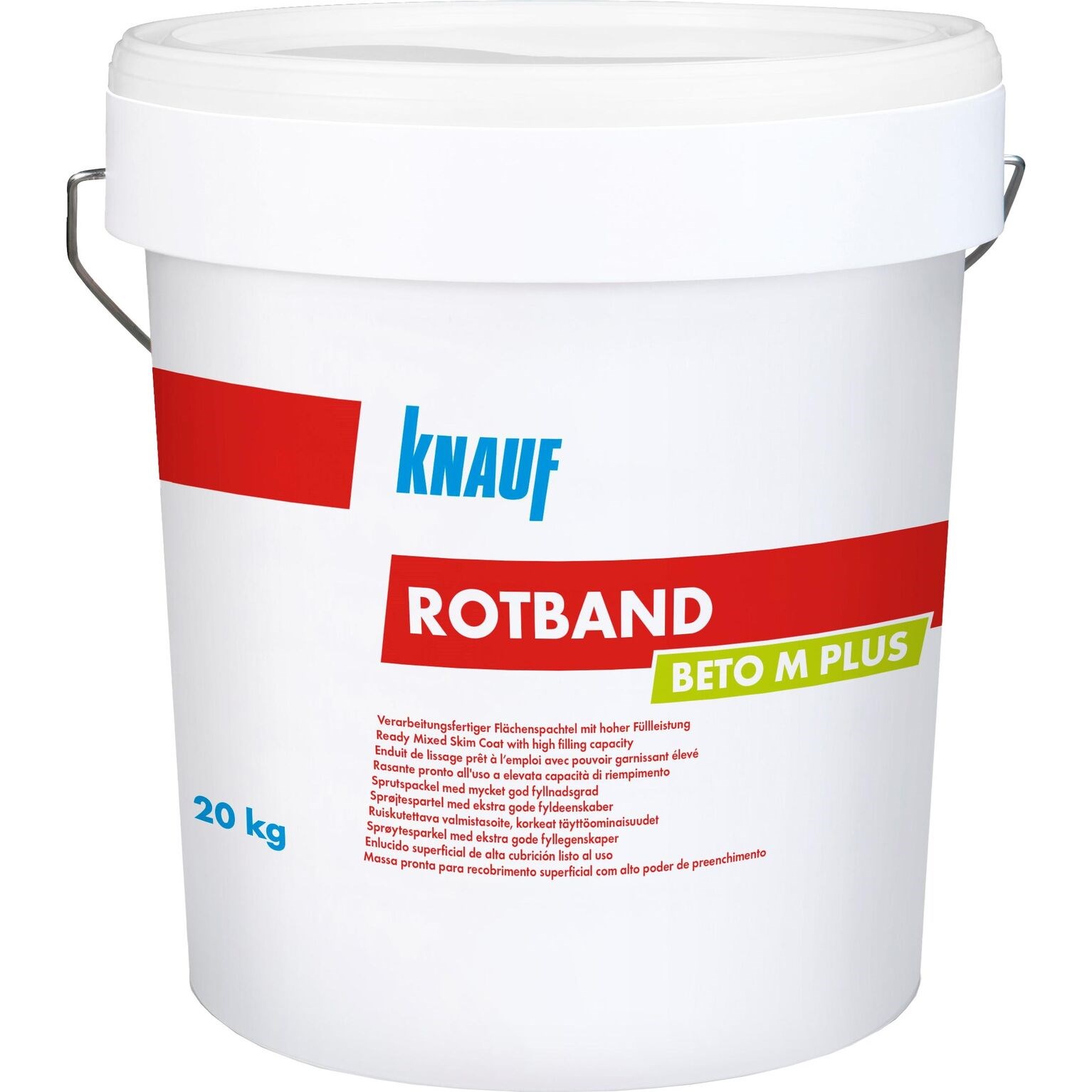 Knauf ROTBAND Beto M Plus ist ein verarbeitungsfertiger Flächenspachtel mit sehr hoher Füllkraft für den Innenbereich, geeignet zum vollflächigen Überspachteln von ortgeschaltem Beton und Betonflächen mit Lunkern und/oder Unebenheiten, zum dünnlagigen Verspachteln von üblichen und ebenen Untergründen, Einbetten von Malervlies und zum Herstellen einer anstrichfertigen Oberfläche, Materialbasis: Calciumcarbonat und Polymerdispersion, Eingenschaften: Verarbeitungsfertig, gutes Haftvermögen, schnelle Trocknung, lösemittel- und weichmacherfrei, Auftragsdicke bis 3 mm pro Schicht, Materialauftrag maschinell mit Airless-Maschine oder von Hand - Auftrag mittels Roller, das Produkt erfüllt die DGNB-Qualitätsstufen QS 1, 2, 3 und 4 sowie Anforderungen nach LEED v4, Verbrauch ca. 1,4 kg/m²/mm