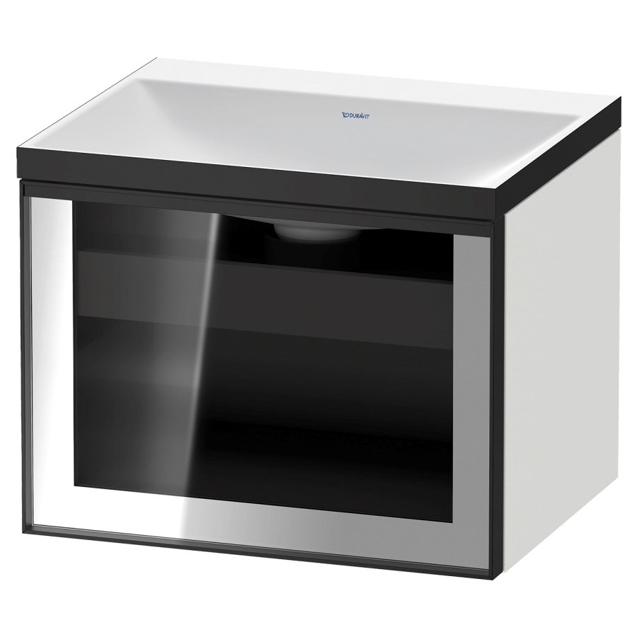 60 x 48.1 x 47.9 cm, Schubladenelement, 1 Schublade, 1 Innenschublade, mit Waschtisch , Mineralguss DuroCast, ohne Überlauf, ohne Armaturenloch, inkl. Raumsparsifon, und Schaftventil, Front Parsolglas Grau, Griffleiste graphit matt