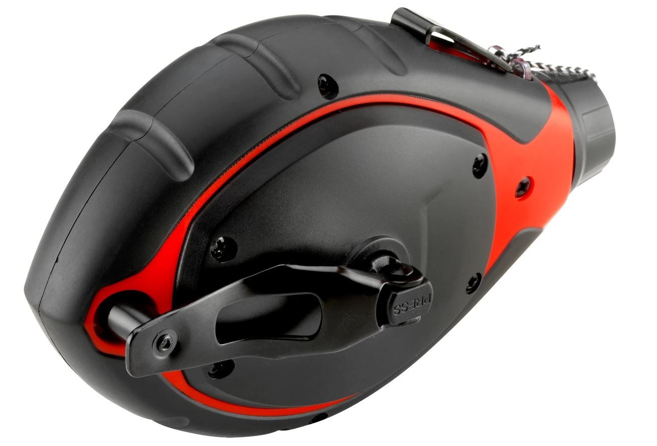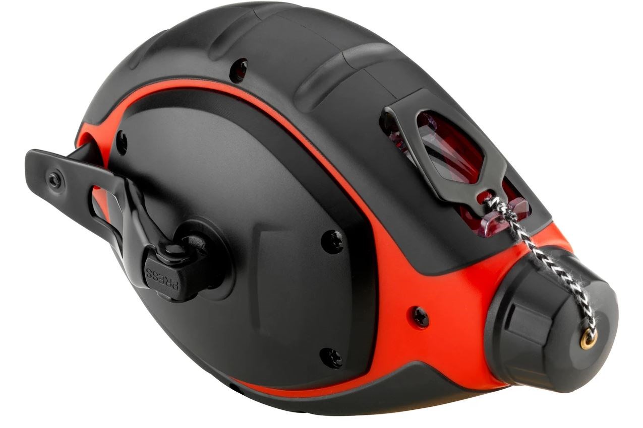 Sechs mal schnellerer Schnureinzug durch Kurbelgetriebe (Übersetzung 6:1), leichtes und robustes Kunststoff-Gehäuse mit Gummiummantelung für ergonomisches Handling, Sichtfenster zum schnellen Ablesen der Kreidemenge im Gerät, Kurbel aus gehärtetem Stahl, integrierter Lagerplatz für Haken, komfortabler Schnurauszug: Freilauf-Funktion durch Drücken der Kurbelachse