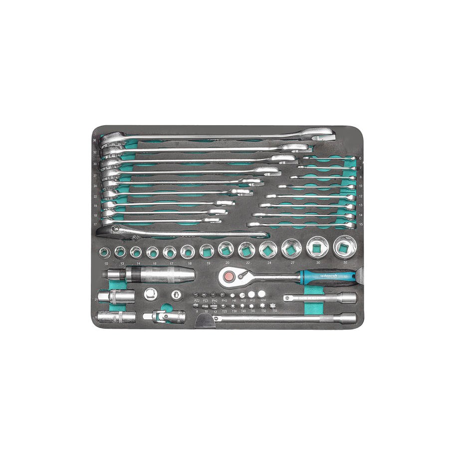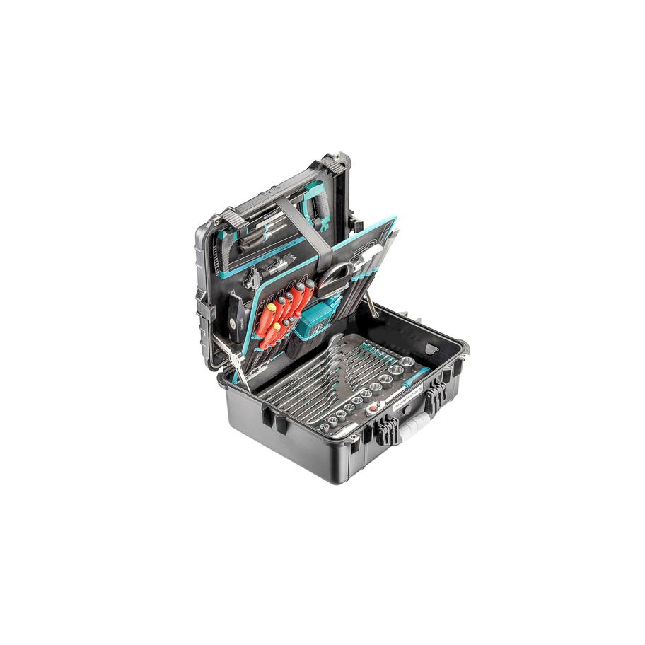Der robuste PP-Werkzeugkoffer für die Baustelle, spezieller Werkzeugsatz für den Unterhalt von Baumaschinen, robuster und langlebiger Poly-Propylen Werkzeugkoffer mit 4 starken Verschlüssen, der Deckel wird von zwei massiven Deckelstützen gehalten, welche justiert werden können, der Koffer wurde nach IP65 getestet (= staubdicht und geschützt gegen Strahlwasser aus einem beliebigen Winkel), die Werkzeuge sind speziell ausgelegt für den Unterhalt an schweren Baumaschinen, so sind ein 800 gr. Schlosserhammer, Gabelringschlüssel von 6 bis 36 mm, Lagerabzieher, Inbusschlüssel bis 17 mm, Magnetschale usw. mit dabei, der Koffer kann mit einem Vorhängeschloss abgeschlossen werden (nicht im Lieferumfang), Abmessung: 545 x 440 x 205 mm